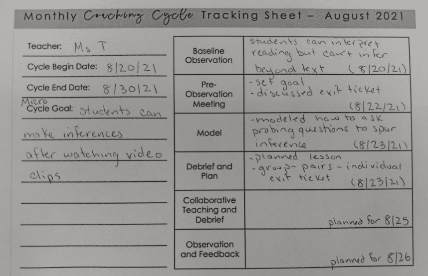 For the micro-coaching cycle goal above, you might plan to look at an exit ticket in which students see a short video clip and then list three inferences based on the clip.